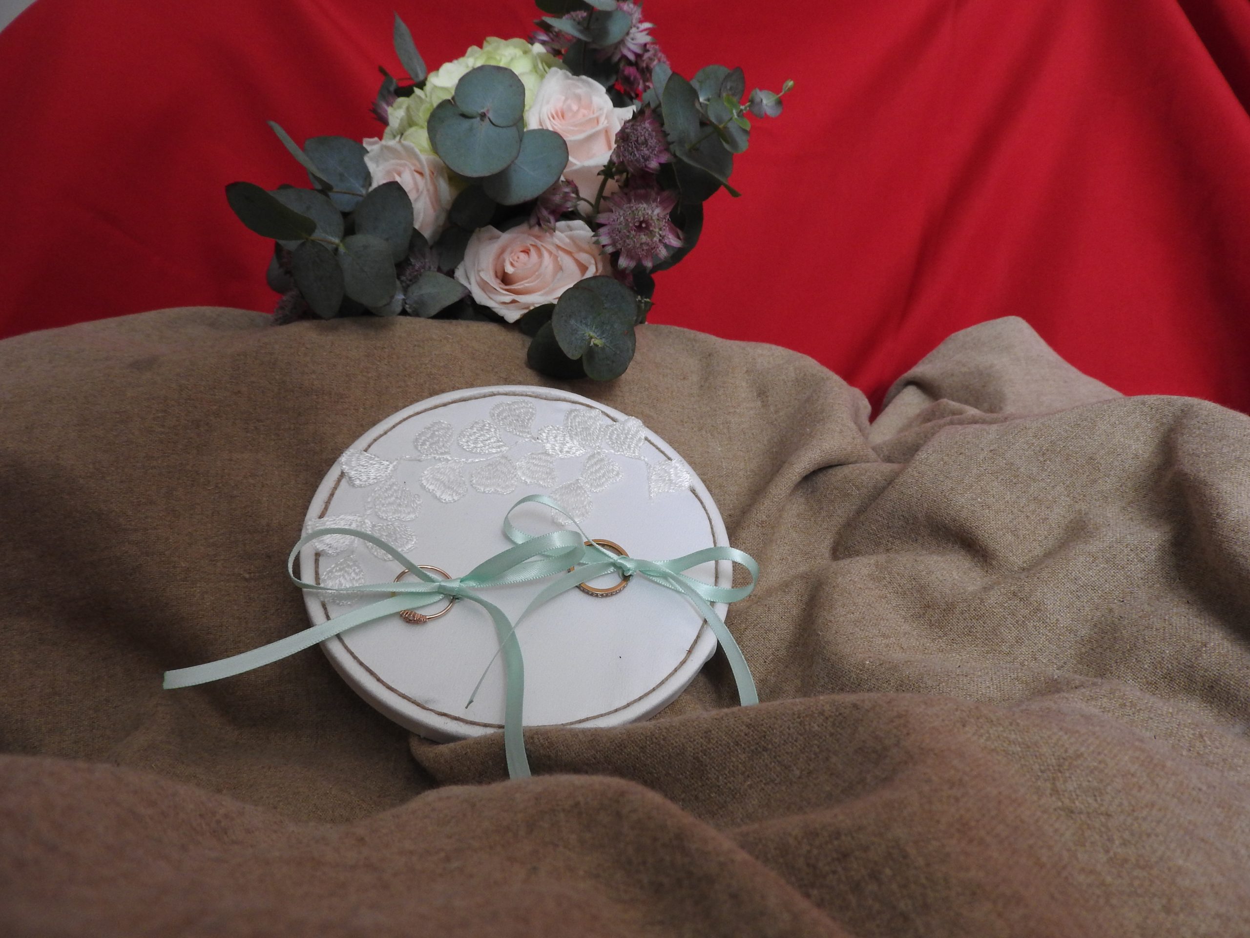 Son satin ivoire délicatement brodé met en valeur vos alliances, tandis que les rubans vert pastel et le cordon en toile de jute apportent une touche champêtre et raffinée.