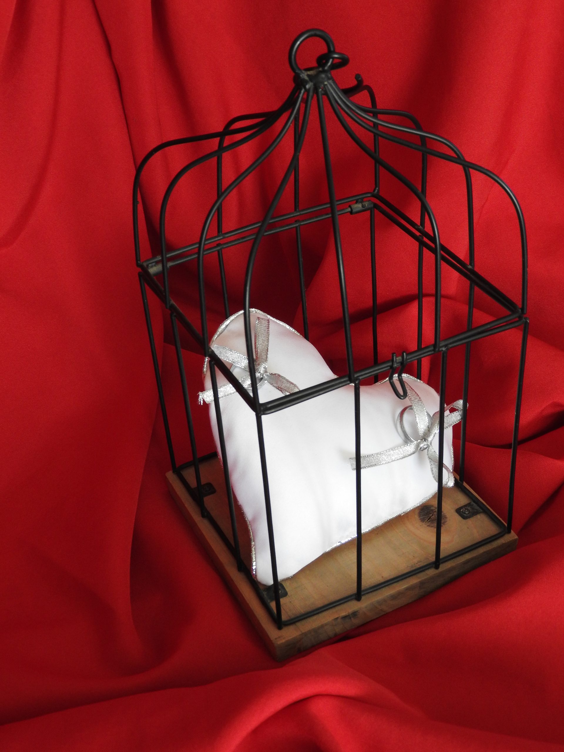 Il est habillé de passepoil et de rubans argentés captant la lumière avec douceur et saura sublimer votre cérémonie du fond de sa cage.